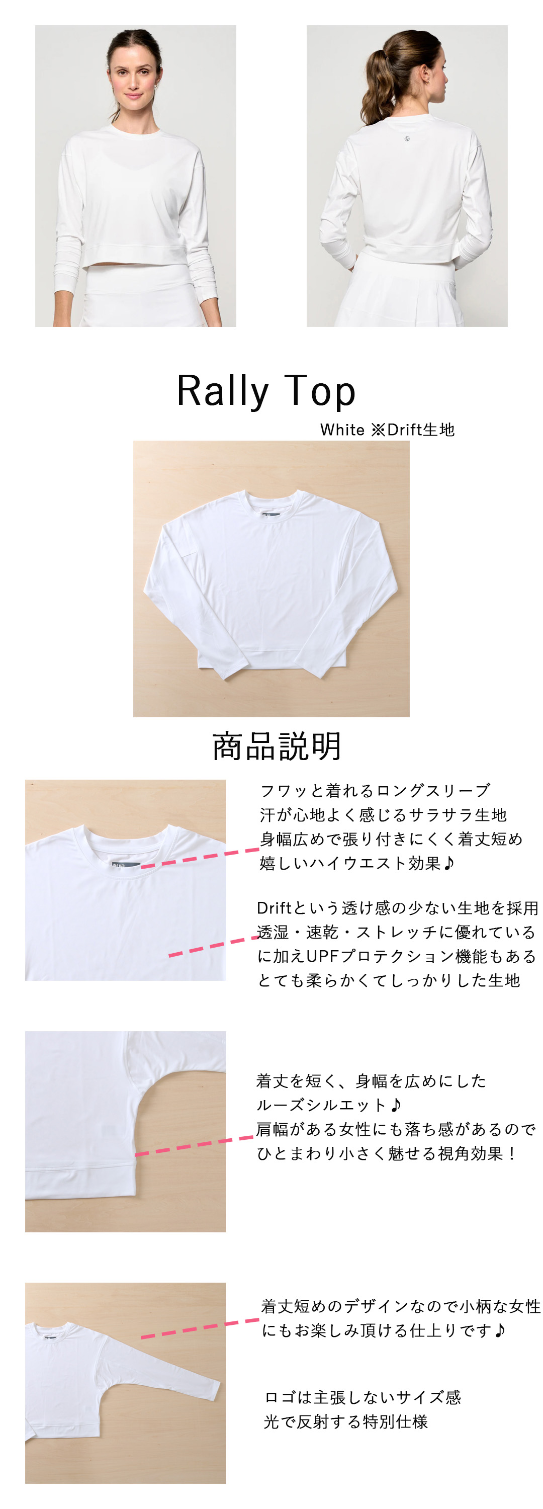 SALE返品不可 RallyTopラリートップ|テニスウェア|長袖|White|Drift生地