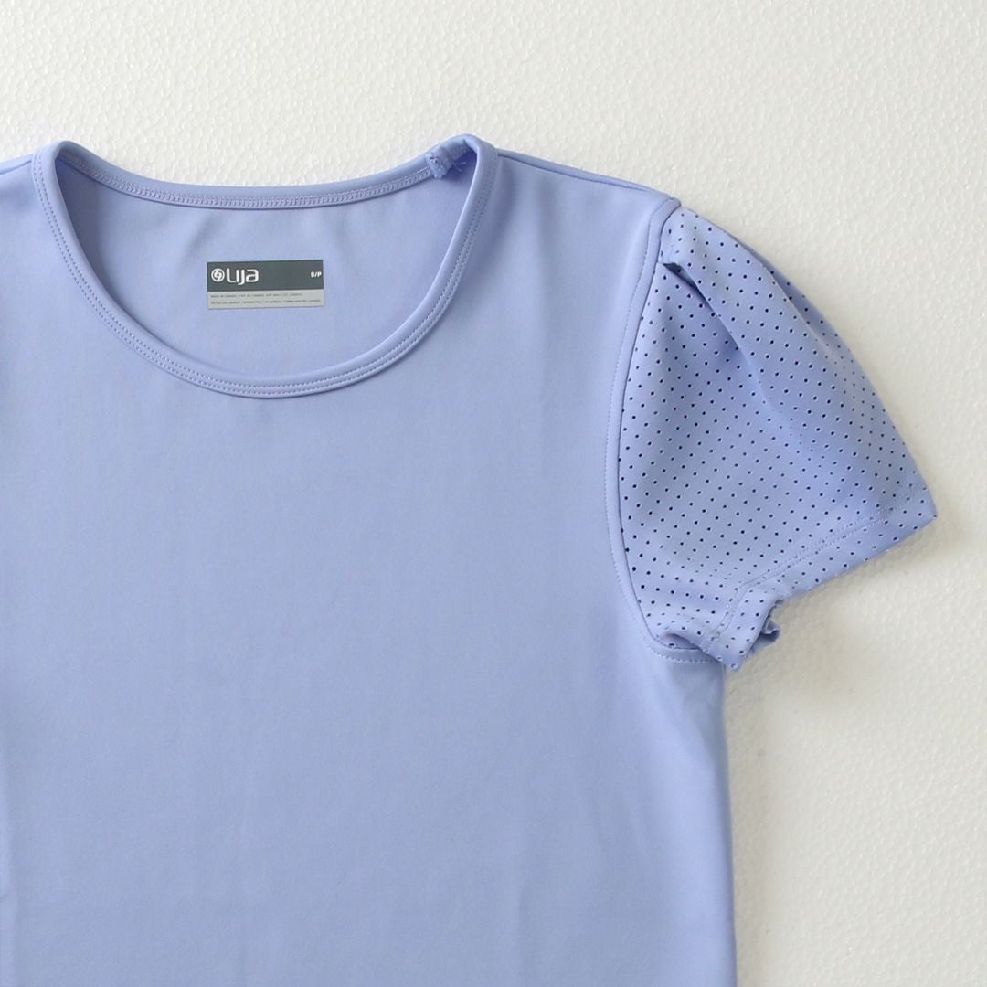 脇が大きく開いた袖のデザインは、発汗しても影響がなく、安心です。