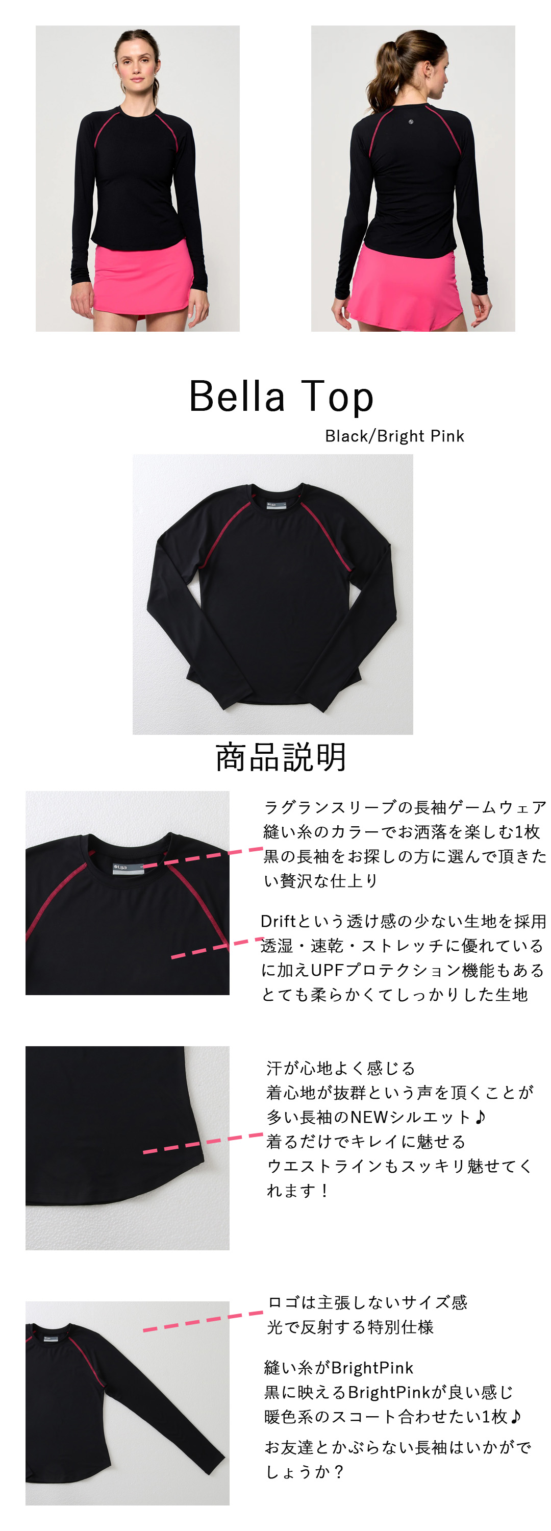 BellaTopベラトップ|テニスウェア|長袖|BlackBrightPink